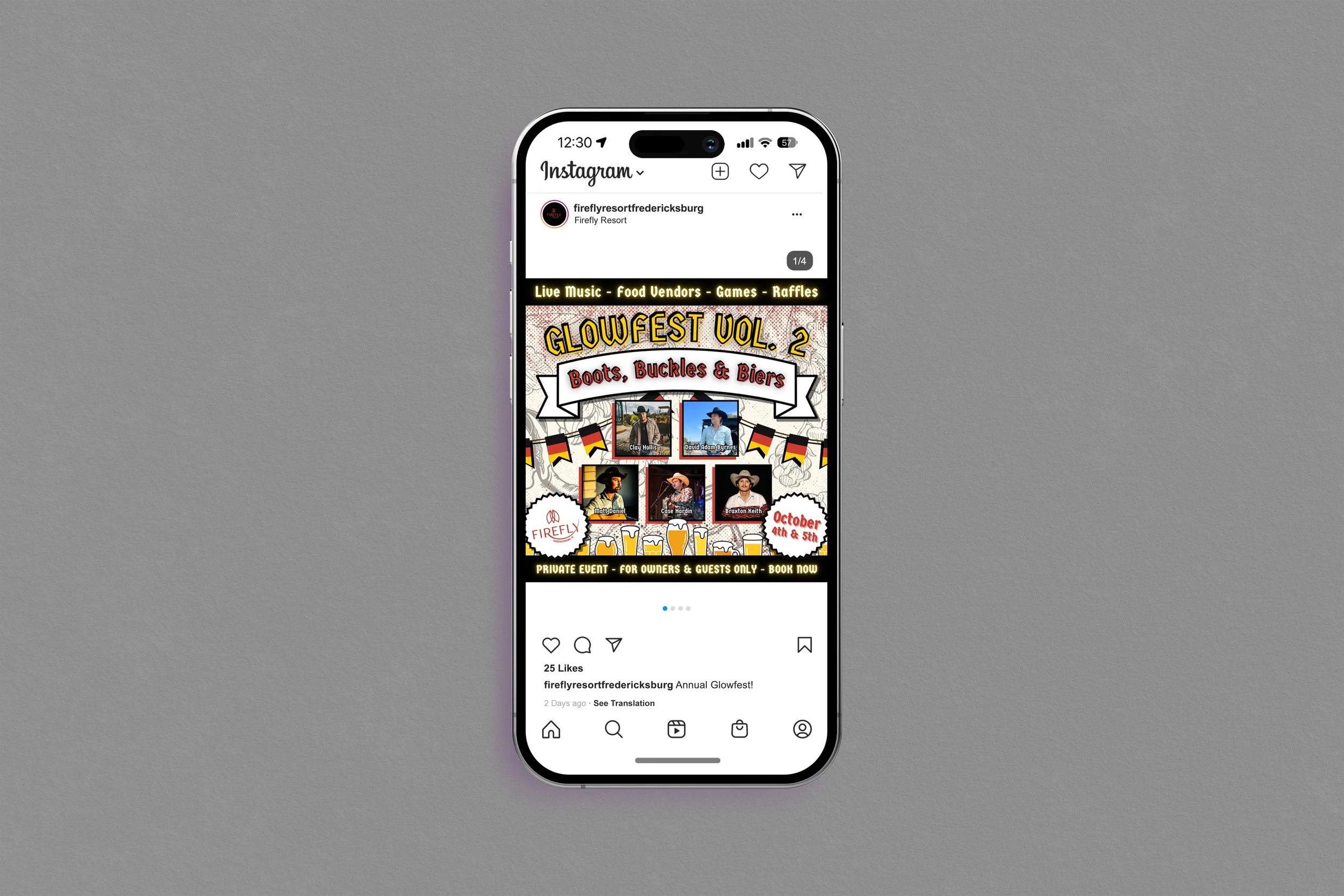 social media post created for the annual glowfest event hosted by firefly resort. this event takes place the same time the local oktoberfest is held. this was designed to pull from that crowd.
